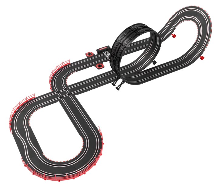 Das Carrera GO!!! Set ?Tuning Zone" vereint aufregende Rennen mit kreativen Möglichkeiten. Die Hypercars im Maßstab 1:43 beeindrucken mit einem futuristischen Design, das an die Ästhetik moderner Zukunftsautos erinnert. Ihre dynamische Form und stilvolle Details machen sie zu echten Hinguckern und zu einem Highlight der Carrera-Welt. Die 5,3 Meter lange Strecke bietet mit Elementen wie Loopings, einer Kreuzung und einem Fly-Over jede Menge Abwechslung und Spannung. Präzise Steuerung und blitzschnelle Reaktionen sind gefragt, wenn die Hypercars zu Höchstgeschwindigkeit aufdrehen.