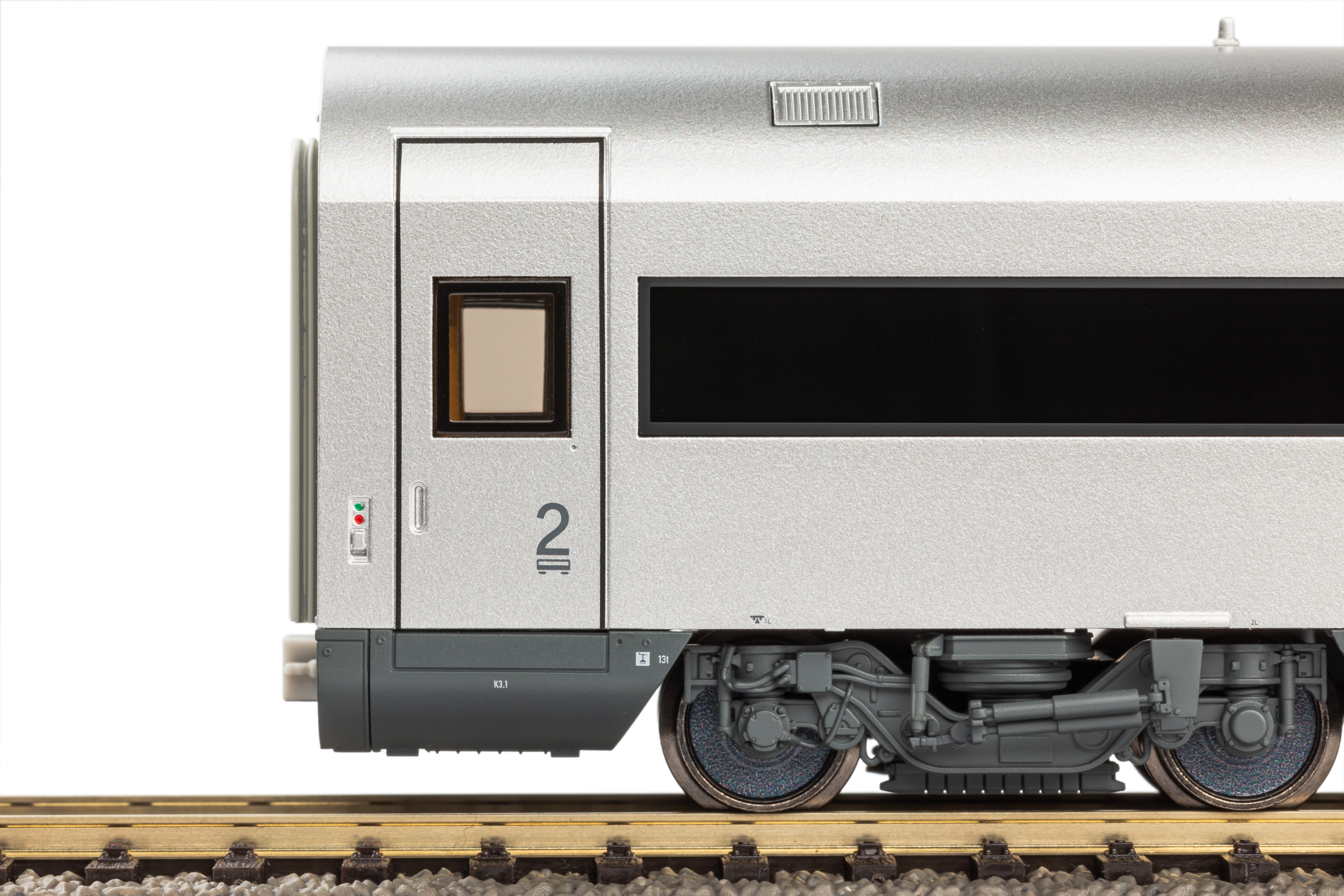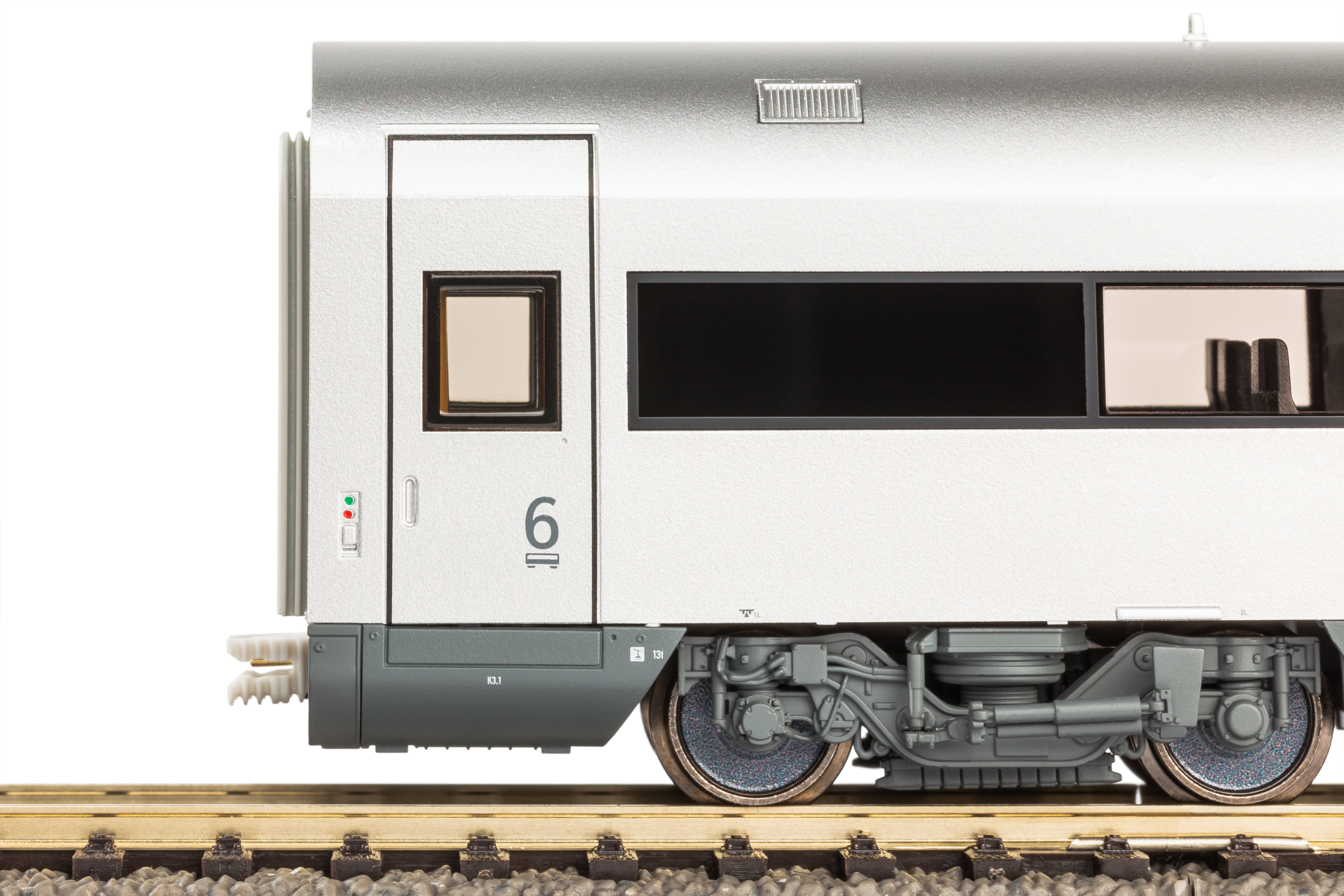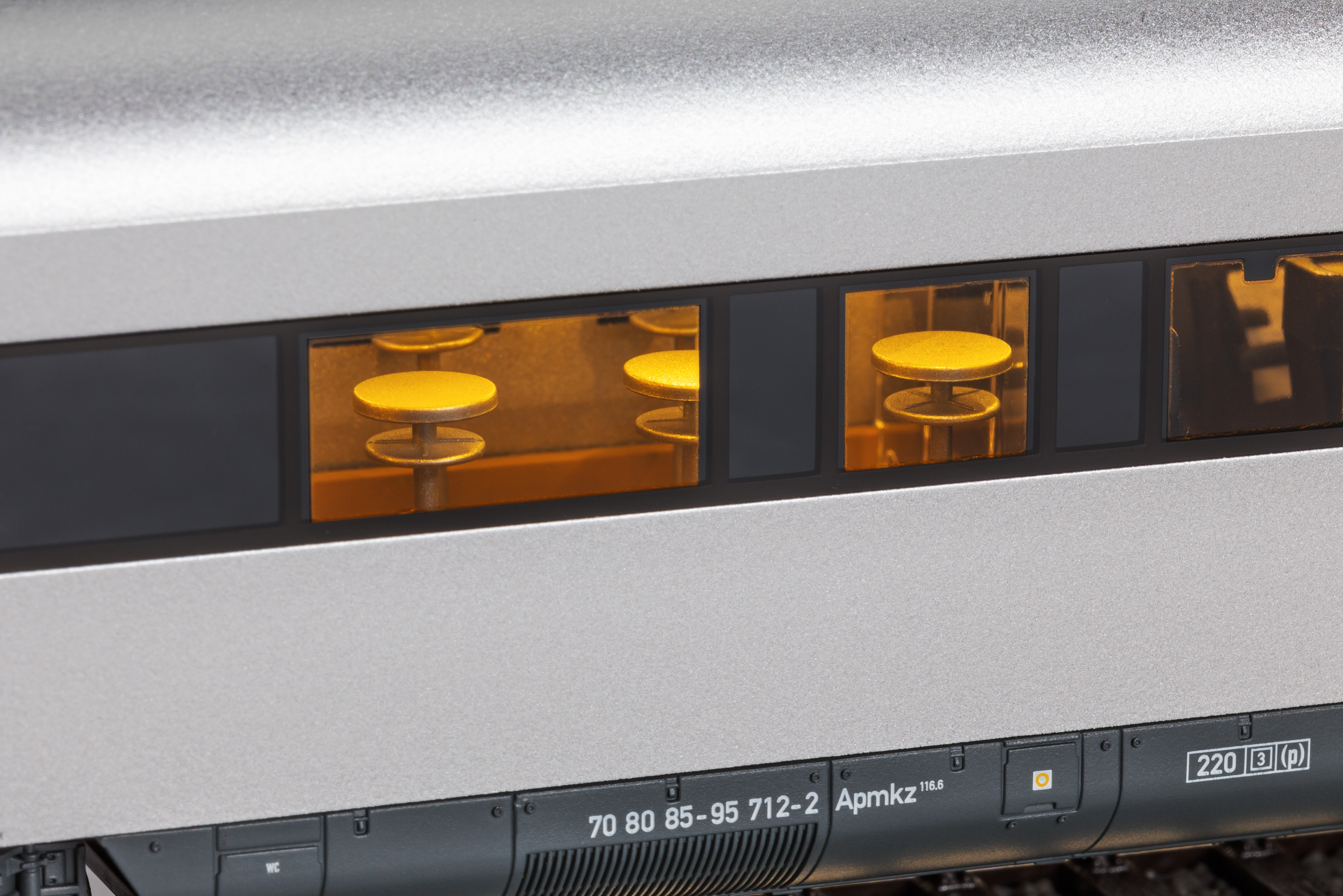 Von außen überzeugen die Modelle durch ihr elegant anmutendes Erscheinungsbild, welches dem des Vorbildes in nichts nachsteht. Durch die perfekt bündig eingesetzten, glasklaren Fenster fällt der Blick in den Innenraum. Alle Wagen verfügen über eine individuelle, passend abgestimmte Inneneinrichtung. Ein weiteres Highlight sind die scharf gravierten Drehgestelle und die detailliert nachgebildeten Wagenböden. Plastisch anmutende Gravuren sowie eine vorbildgerechte Lackierung mit konturenscharfen Beschriftungen runden den äußeren Eindruck perfekt ab. Auf der Anlage befördert die kraftvolle BR 101 die Wagengarnitur seidenweich über die Gleise. Alle Wagen verfügen zudem über eine stimmige indirekte Innenbeleuchtung, um ein harmonisches Ambiente zu schaffen.