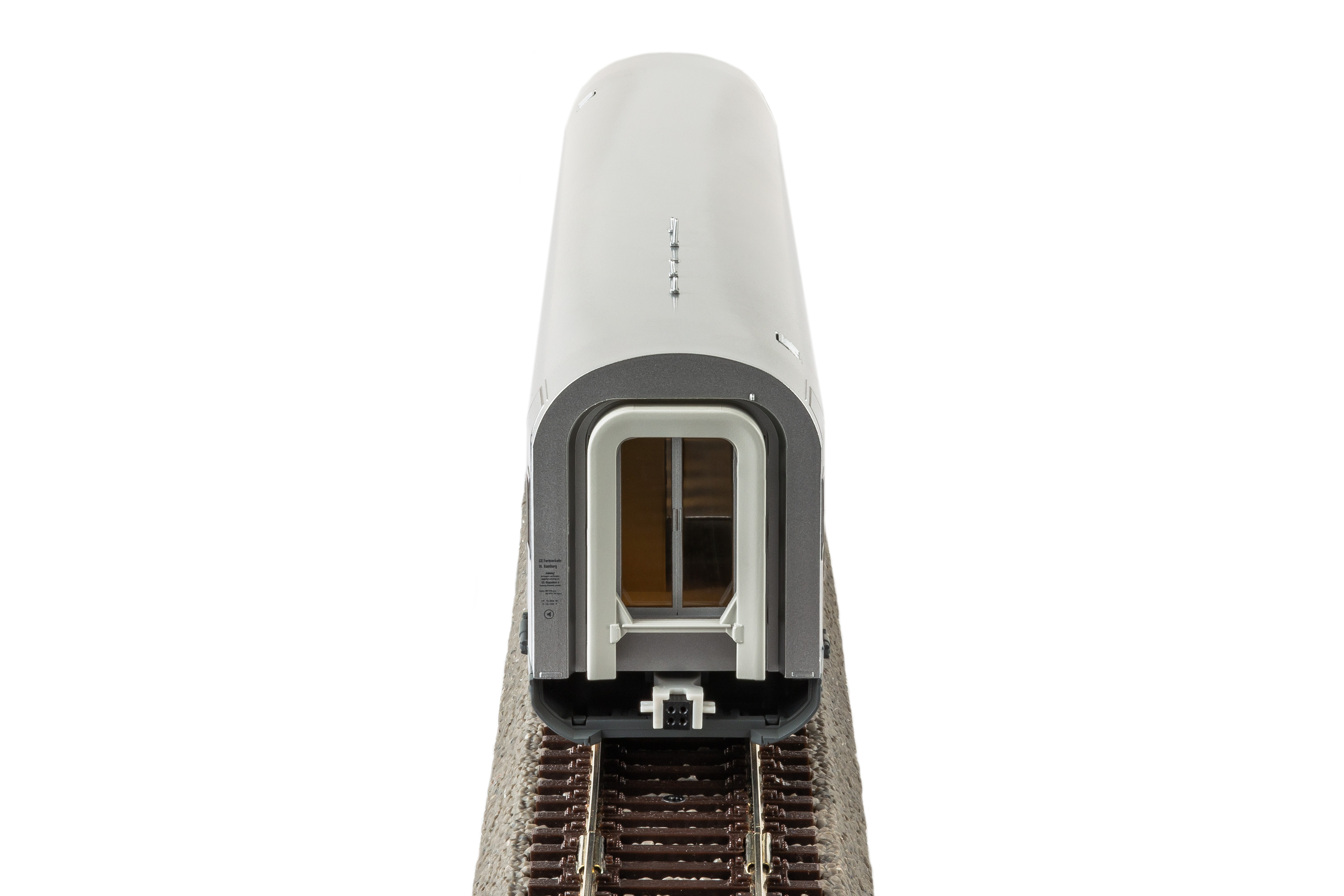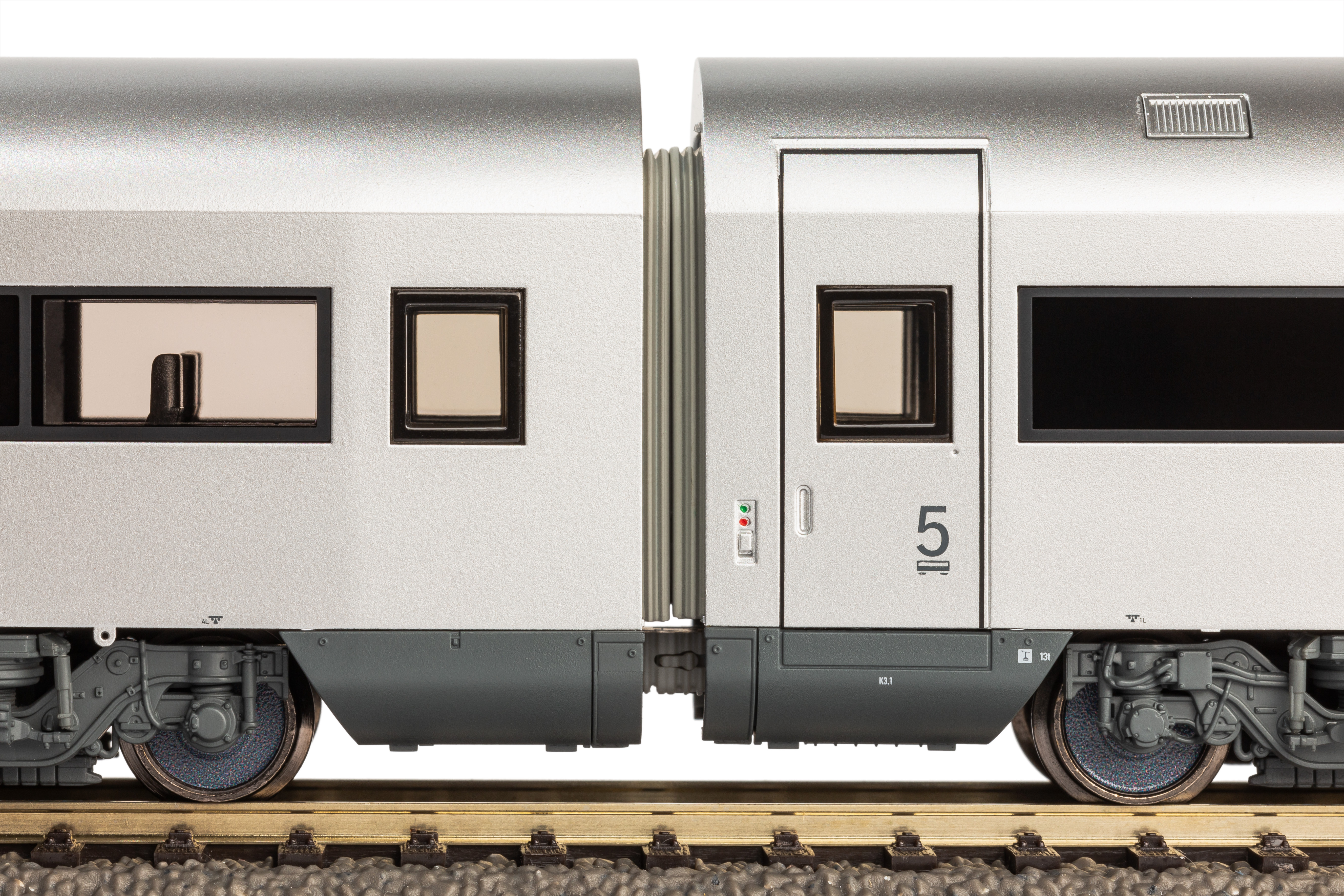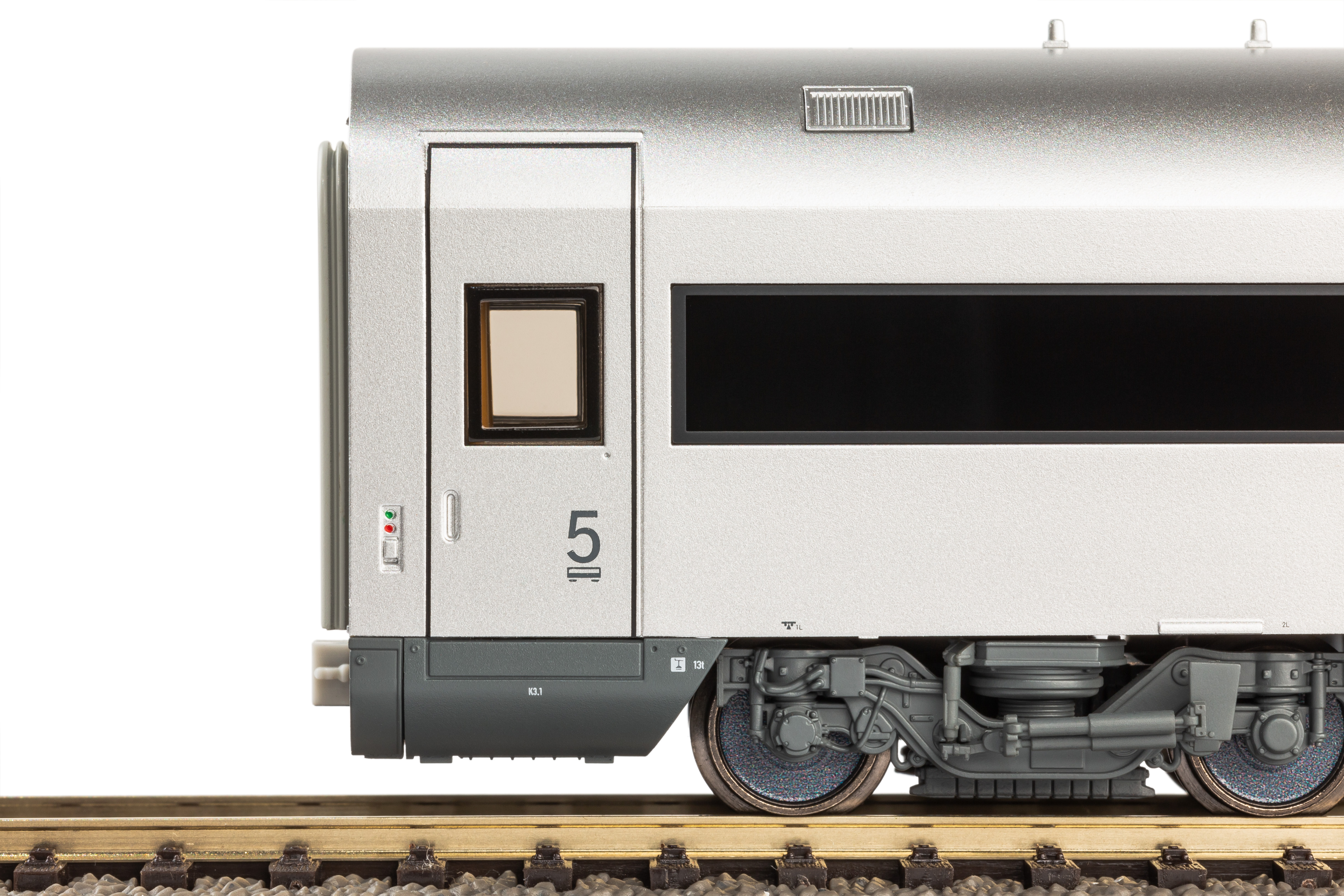 Von außen überzeugen die Modelle durch ihr elegant anmutendes Erscheinungsbild, welches dem des Vorbildes in nichts nachsteht. Durch die perfekt bündig eingesetzten, glasklaren Fenster fällt der Blick in den Innenraum. Alle Wagen verfügen über eine individuelle, passend abgestimmte Inneneinrichtung. Ein weiteres Highlight sind die scharf gravierten Drehgestelle und die detailliert nachgebildeten Wagenböden. Plastisch anmutende Gravuren sowie eine vorbildgerechte Lackierung mit konturenscharfen Beschriftungen runden den äußeren Eindruck perfekt ab. Auf der Anlage befördert die kraftvolle BR 101 die Wagengarnitur seidenweich über die Gleise. Alle Wagen verfügen zudem über eine stimmige indirekte Innenbeleuchtung, um ein harmonisches Ambiente zu schaffen.