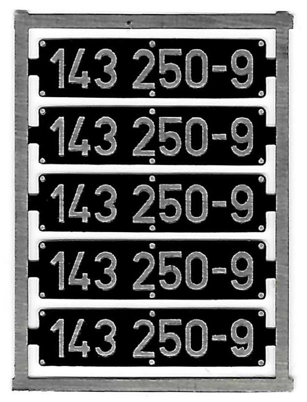 - Zusätzliche Lokschilder (143 250-9) aus Neusilber geätzt, liegen jeder Lok zur Selbstmontage bei.