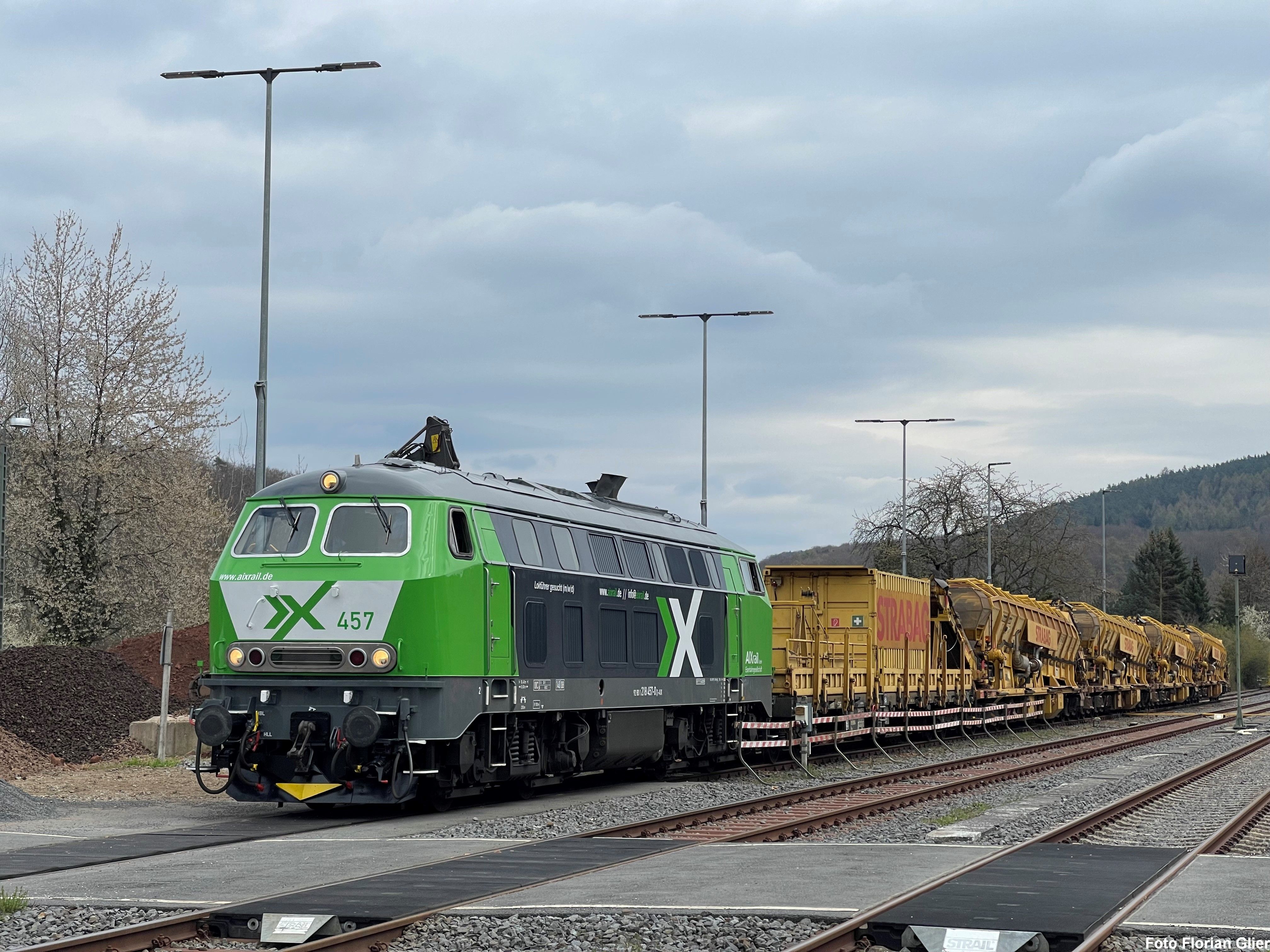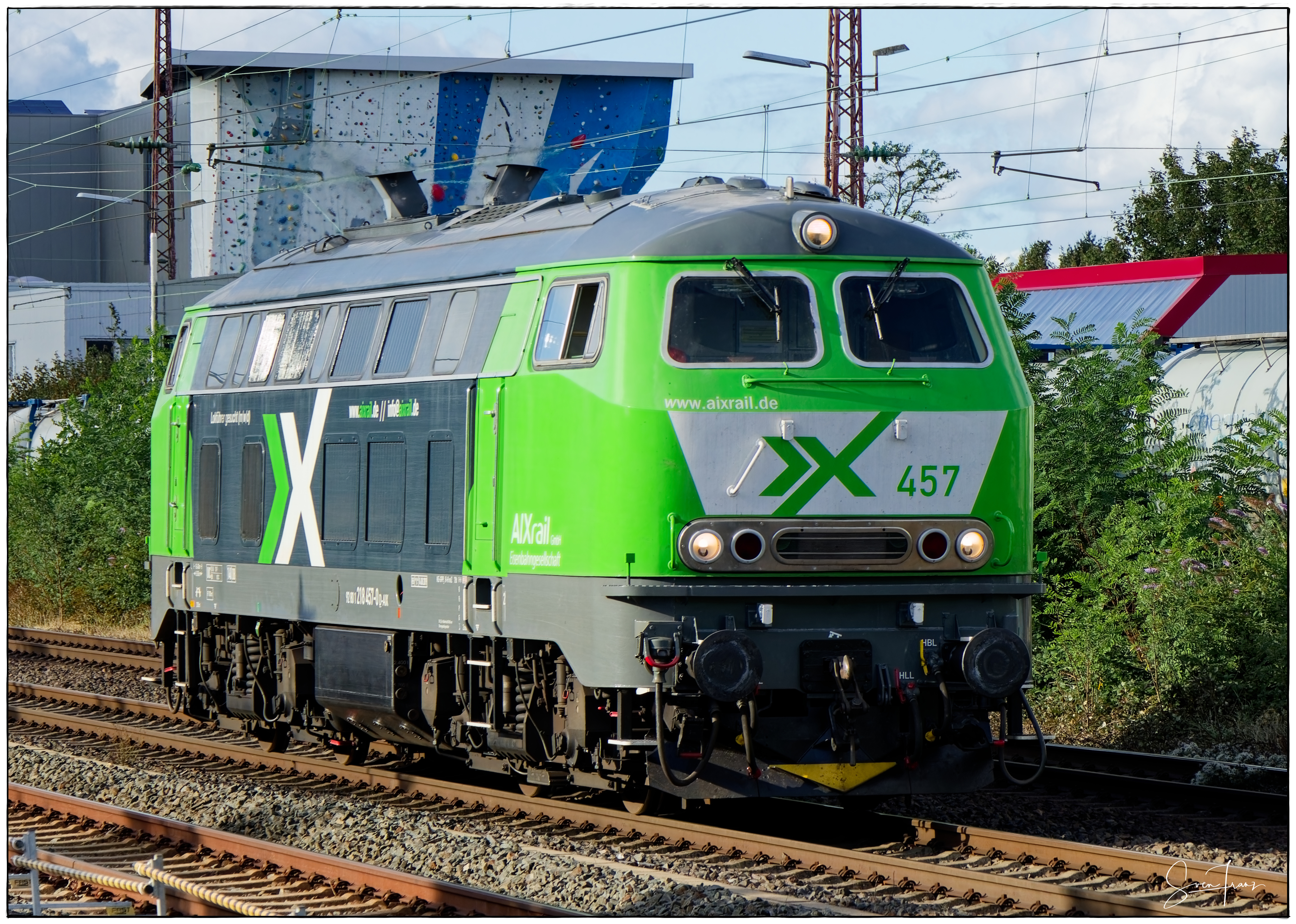 Ab 1971 stellte die Deutsche Bundesbahn 398 Serienloks der BR 218 in Dienst und setzt sie sowohl vor Reise- als auch vor Güterzügen ein. Sie werden auf den meisten nicht elektrifizierten Strecken eingesetzt und erreichen eine Höchstgeschwindigkeit von 140 km/h bei einer Leistung von 1.840 kW. Die Baureihe 218 hat im Laufe der Zeit einige Farbvarianten durchwandert. Die ersten 218er wurden noch in der für Diesellokomotiven üblichen Farbgebung in purpurrot geliefert. Ab 1975 bestimmten die Farben Ozeanblau/Beige das äußere Bild der Lokomotiven. Unsere 218 457 wurde 1978 bei Henschel & Sohn in Kassel gebaut und in den Farben Ozeanblau/Beige an die damalige Deutsche Bundesbahn ausgeliefert. Seit Ende 2019 ist die Lok im Besitz der AIXrail Gmbh Aachen zuerst noch in verkehrsroter Lackierung, erstrahlt Sie nun in einem neuen Farbkleid im auffälligen AIXrail-Design. Nach der damit verbundenen Sanierung des Lokkastens, ist die Lokomotive seit Anfang März 2023 wieder in Betrieb.